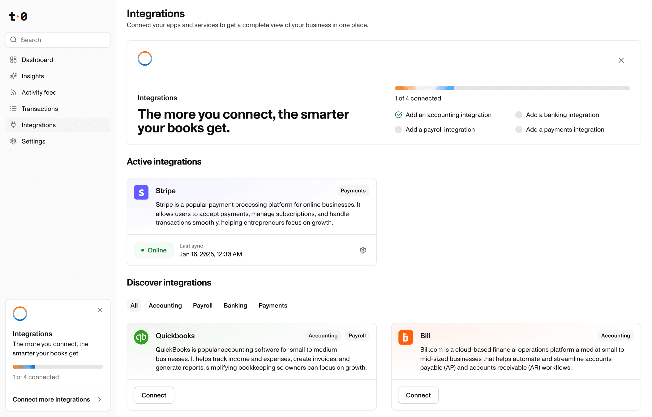Most finance tools make you piece everything together. You go one place for bookkeeping, another for CFO support, and then hire someone else for taxes. With t0, it’s all handled in one place.